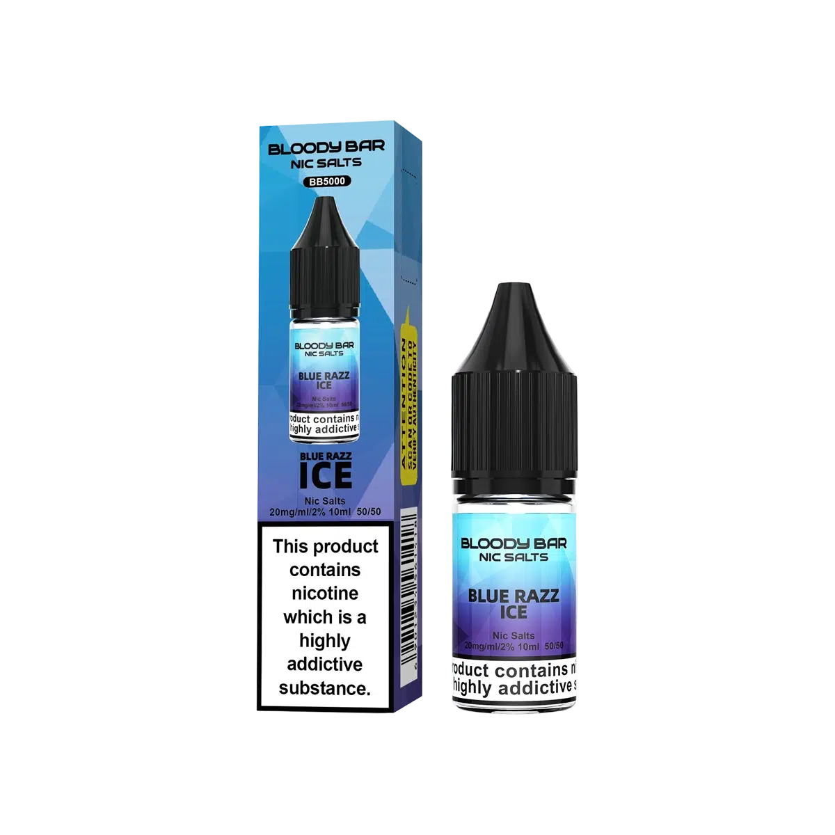 Blue Razz Ice Nic Salt E-Liquid by Bloody Bar offers a delicious burst of sweet blue raspberry flavour on the inhale, perfectly balanced by a crisp, icy finish for a refreshing vape experience.
