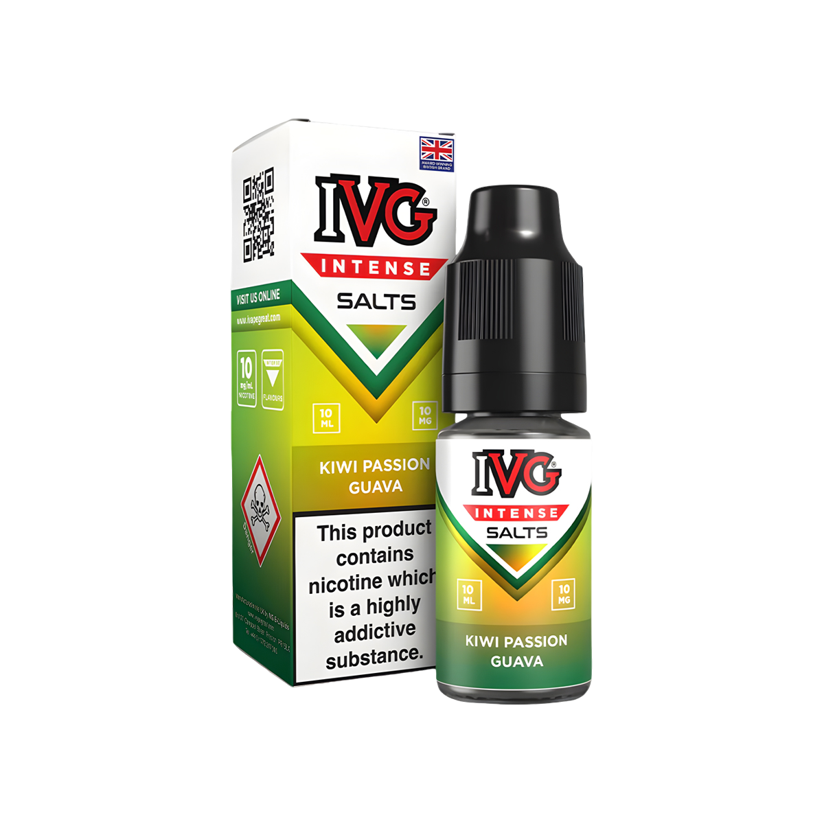 Kiwi Passion Guava Nic Salt E-Liquid by IVG Intense Salts, crafted with a 50% VG and 50% PG ratio, this vape juice produces a mild amount of vapour, perfect for MTL (Mouth To Lung) vaping — replicating the sensation of smoking a traditional cigarette. For the best performance, pair it with your favourite refillable MTL vape kit.