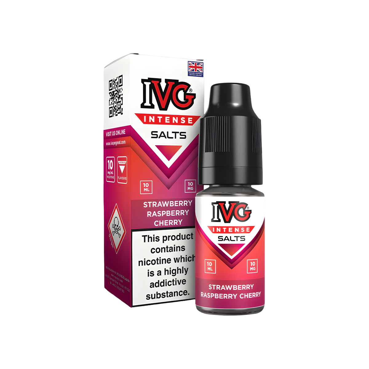 Strawberry Raspberry Cherry Nic Salt E-Liquid by IVG Intense Salts delivers a bold fusion of juicy strawberries, tangy raspberries, and rich red cherries for a sweet and fruity vape bursting with flavour.