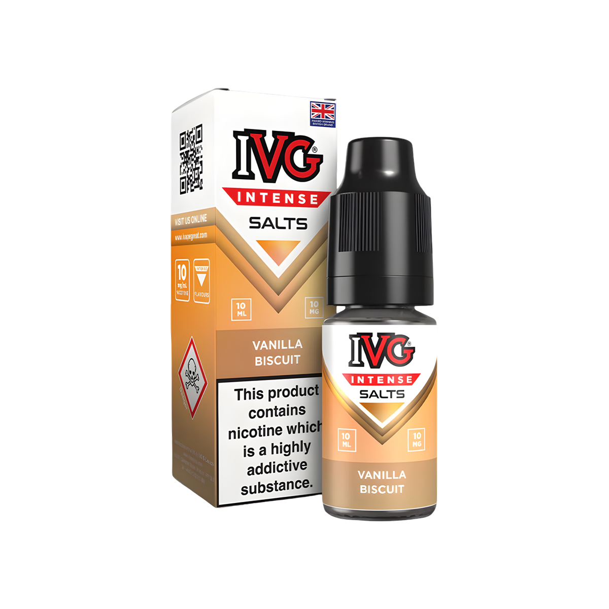 Vanilla Biscuit Nic Salt E-Liquid by IVG Intense Salts, crafted with a 50% VG and 50% PG ratio, this vape juice produces a mild amount of vapour, perfect for MTL (Mouth To Lung) vaping — replicating the sensation of smoking a traditional cigarette. For the best performance, pair it with your favourite refillable MTL vape kit.
