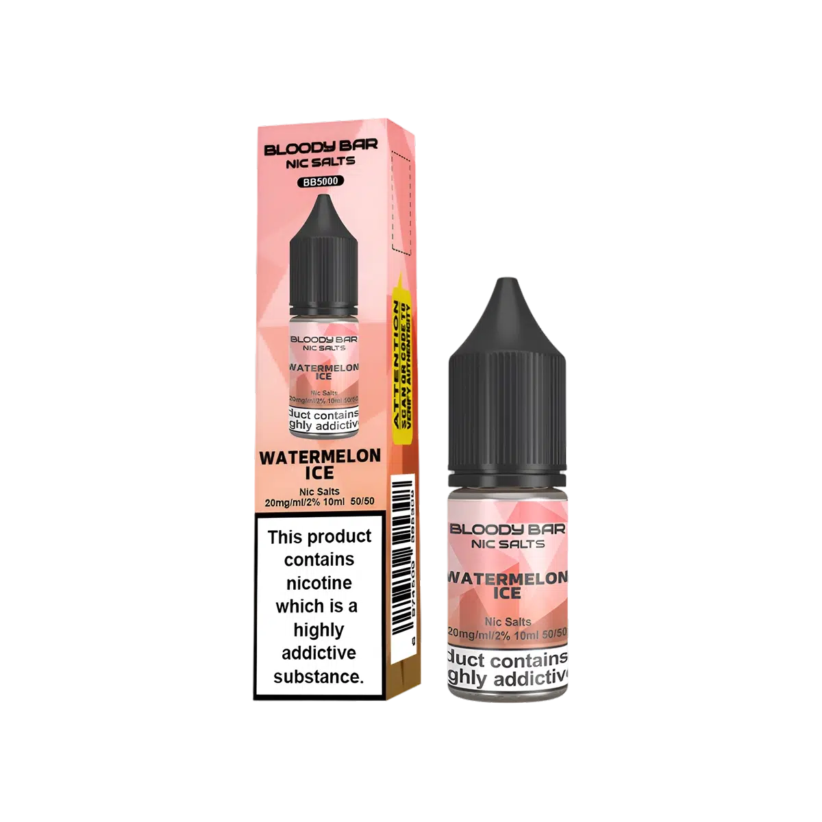 Watermelon Ice Nic Salt E-Liquid by Bloody Bar (Gummy Bear) available in 10mg and 20mg nicotine strengths, this nic salt formula provides a smooth throat hit while quickly satisfying cravings. Each 10ml bottle features a 50% VG / 50% PG ratio, ideal for MTL (Mouth To Lung) vaping — giving you a cigarette-like draw with discreet vapour production.